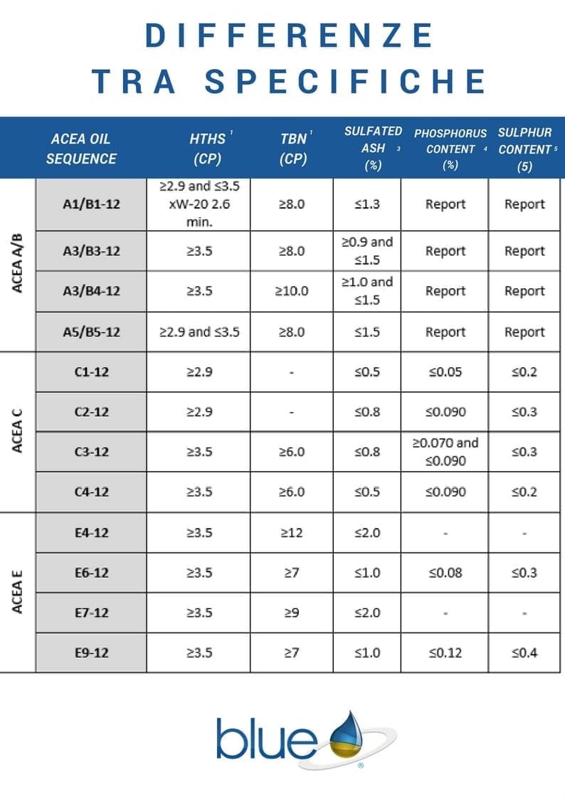 “Specifiche ACEA: qualora compaiano le specifiche Acea A/B e C insieme, questo รจ indice del fatto che la formula del lubrificante non รจ aggiornata. Dal 2012 infatti, secondo gli standard Acea 2012, non รจ piรน possibile raggruppare tali specifiche insieme. Ne si puรฒ dedurre che una formula che le raggruppa รจ precedente all’introduzione delle ultime specifiche.”