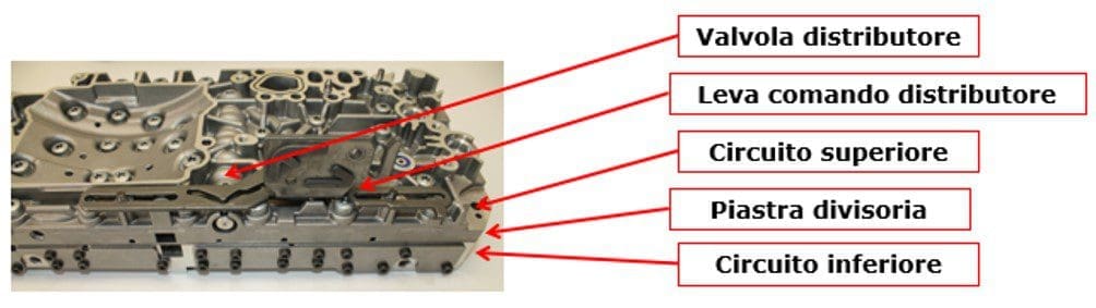 All’interno del distributore idraulico c’รจ il circuito completo per alimentare i componenti che usano l’olio in pressione. Poichรฉ lo spazio รจ ridotto, due o piรน blocchi sono sovrapposti. Essi collegano, a livello idraulico, le valvole meccaniche e le elettrovalvole di gestione.