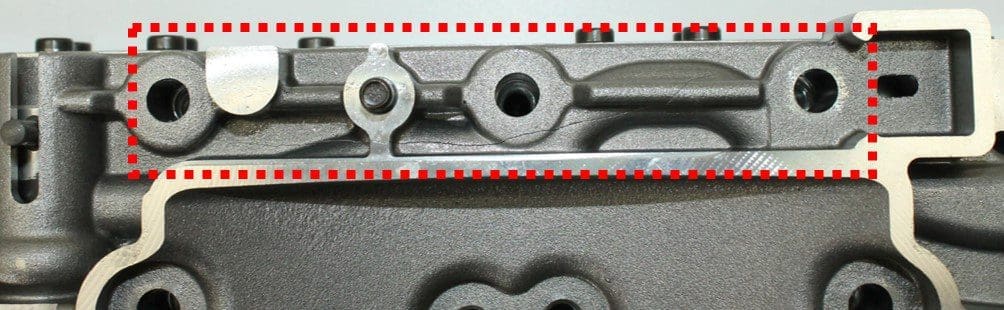 Questo cedimento รจ dovuto al fatto che lo spessore del materiale non รจ in grado di contenere la pressione dellโolio generata in quel tratto. Nel dettaglio, infatti, si vede come la crepa si รจ andata a sviluppare.