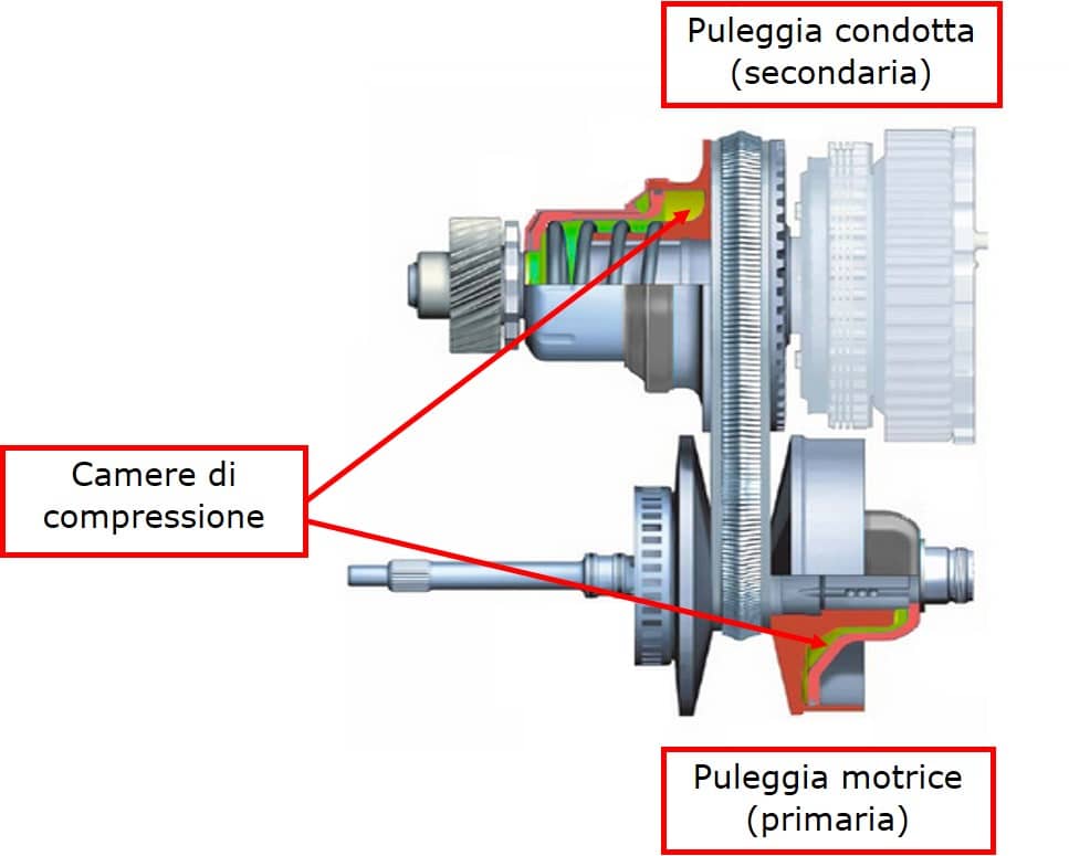 Si intuisce che, al crescere della pressione sulla coppia di dischi primaria, corrisponderร un abbassamento della pressione sulla coppia di dischi secondaria. Sul disco mobile della puleggia condotta รจ installata una molla. Questa รจ in grado di fornire la pressione necessaria alla cinghia metallica, anche quando il cambio รจ senza pressione.