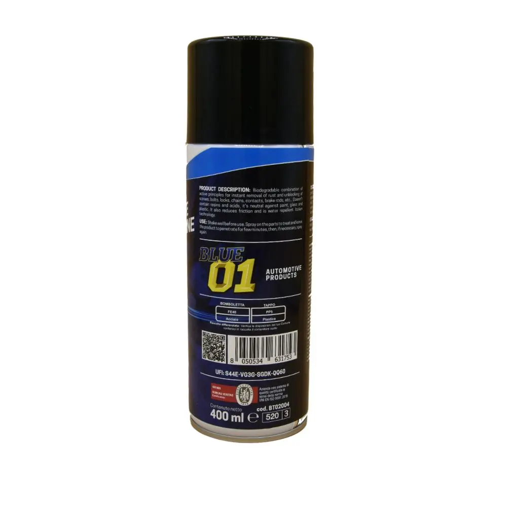 Prodotto biodegradabile di principi attivi per la rimozione istantanea della ruggine. Ideale anche per sbloccaggio viti, bulloni, serrature, catene, contatti, tiranti del freno, ecc.