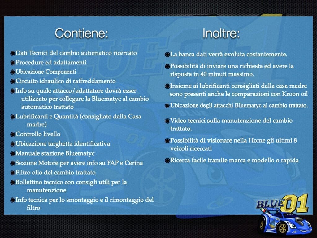 - •Info su quale attacco/adattatore dovrà esser utilizzato per collegare la Bluematyc al cambio automatico trattato